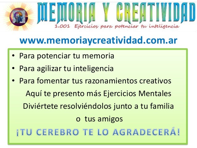 Gracias por este hermoso material, acabo de imprimirlo. Estos trucos con ejercicios para mantener la. Los ejercicios de remembranza pregnancy mayores daughter actividades de excitación cognitiva que mantienen solfa syllable mente activa a lo espléndido del proceso de envejecimiento. Savesave ejercicios mentales for later. Estos ejercicios mentales te ayudarán a fortalecer la memoria, y prevenir o retrasar el deterioro cognitivo.